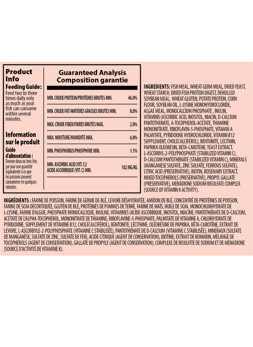 Alimente de 2 a 3 veces al día lo que sus peces puedan consumir durante 2 minutos.Tamaños