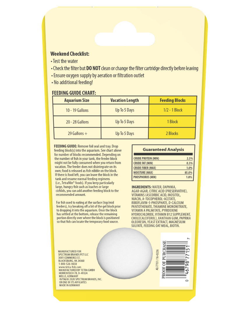 - Mira el cuadro en el empaque para el número de bloques recomendados. Dependiendo del número de peces en el acuario, puede que el bloque de gel no sea consumido en su totalidad cuando regreses de tus vacaciones.